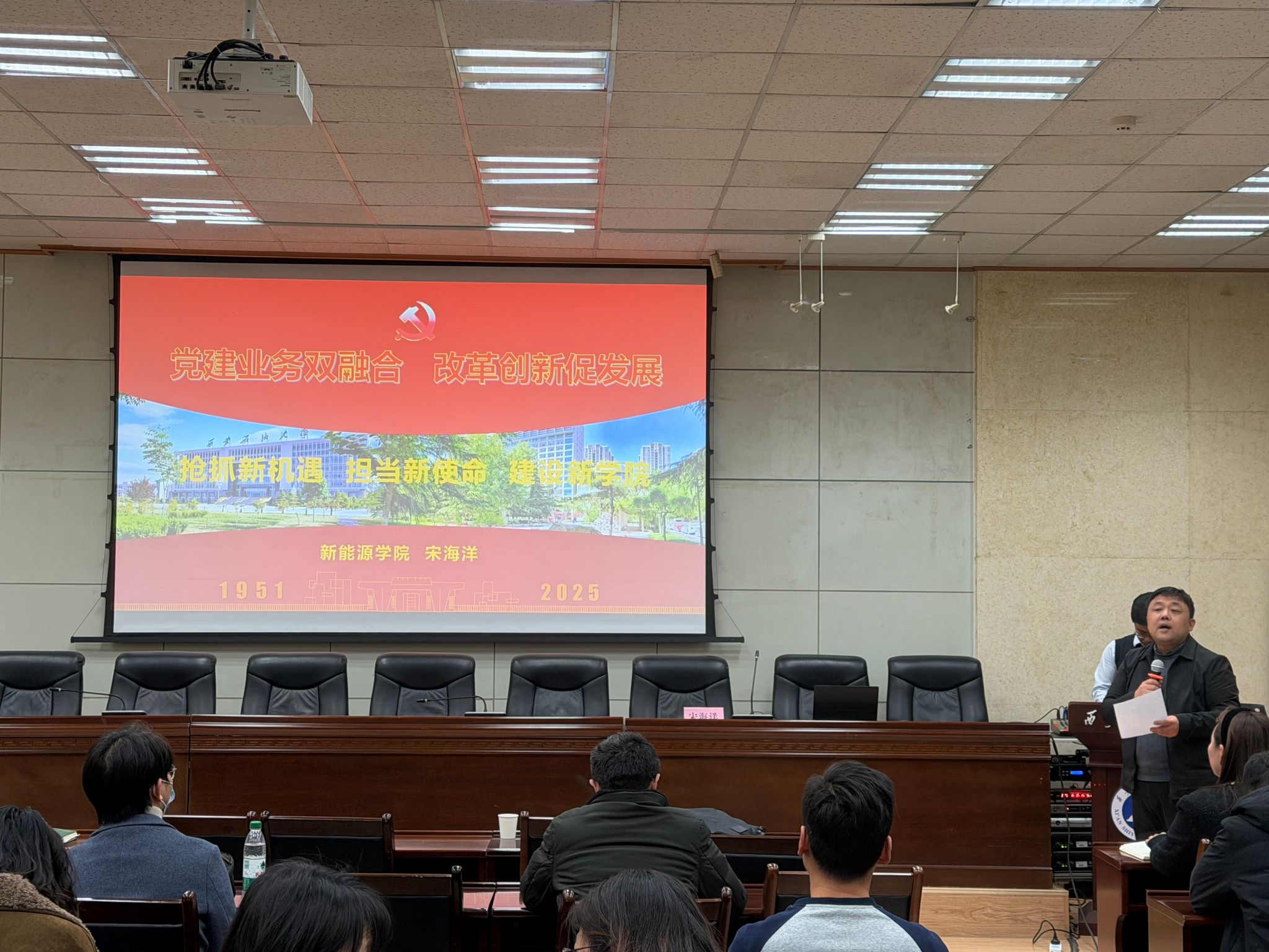 12月10日下午,管道工程学院党委在雁塔校区西阶第三会议室开展了“学党章铸忠诚,悟思想强使命”专题学习班第三讲。本次课程由新能源学院院长宋海洋教授讲授,主题为“党建业务双融合,改革创新促发展-抢抓新机遇,担当新使命,建设新学院”,学院全体教职工、研究生党员代表共70余人参加学习。学习由学院党委副书记高亮主持。