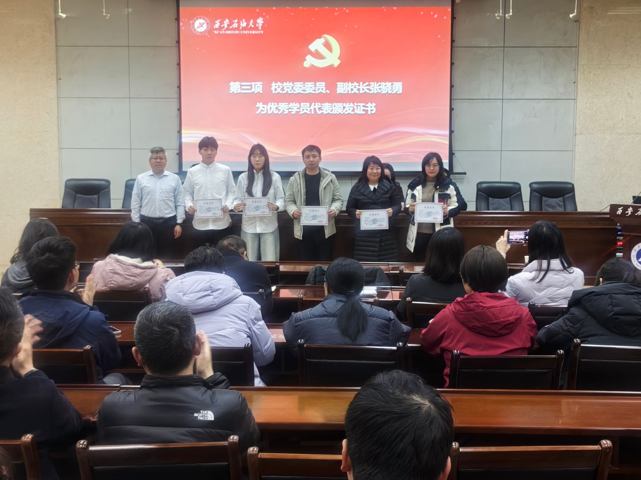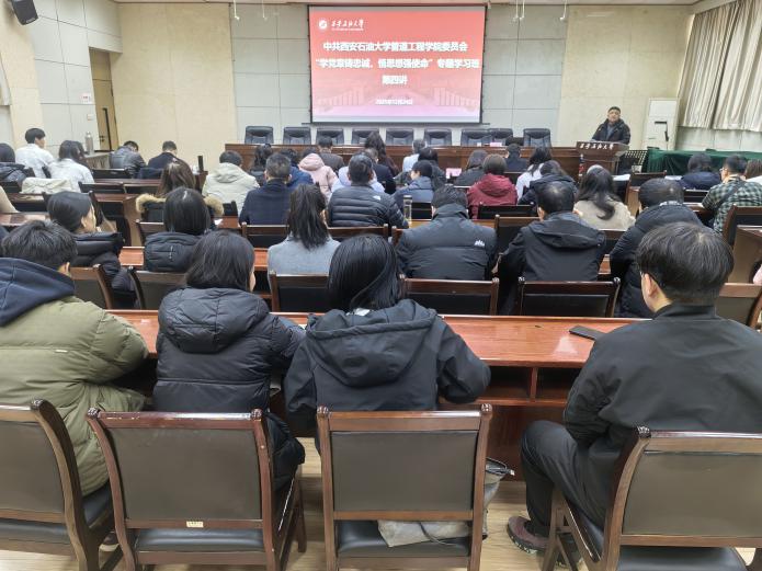 2025年12月24日下午,管道工程学院党委在雁塔校区西阶第三会议室开展“学党章铸忠诚,悟思想强使命”专题学习班第四讲暨结业仪式。校党委委员、副校长张骁勇出席并作第四讲专题报告,学院班子全体成员、全体教工党员、研究生党员代表70人参加仪式。仪式由学院党委副书记高亮主持。