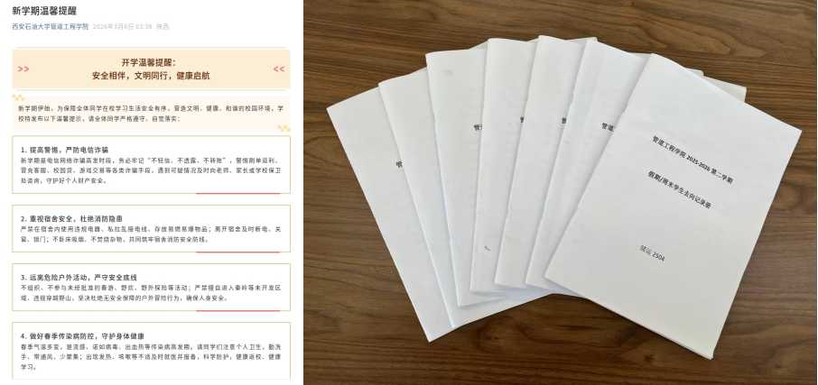 为进一步强化学生的安全防范意识,切实筑牢校园安全防线,规范日常行为管理,营造安全、和谐、有序的学习生活环境,确保新学期各项工作平稳有序开展,管道工程学院各年级在鄠邑校区召开了2026年春季学期开学安全教育系列工作。