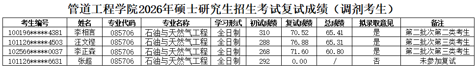 根据《西安石油大学2026年硕士研究生招生复试录取工作办法》要求,结合《西安石油大学管道工程学院学院2026年硕士研究生招生复试录取工作实施细则》,现将2026年硕士研究生复试成绩(调剂第二批-石油与天然气工程(085706))予以公示。如有异议,可通过以下方式反映。